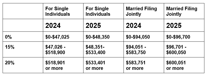 As the accompanying table shows, in 2025, for a couple filing jointly, the first $96,700 of capital gains will be taxed at 0% — that is, tax free! The same couple would only get the first $30,000 of ordinary income (the standard deduction) tax free. Additionally, as you can see, capital gains are taxed at much lower rates than ordinary income.