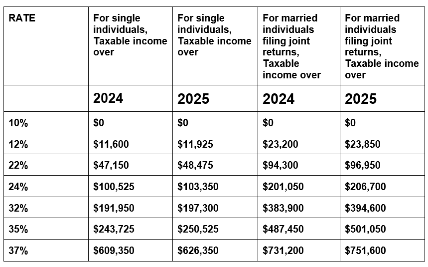 The 2024 and 2025 federal tax tables shown above reveal how the tax brackets are increased annually based on inflation. Thus for a married couple filing jointly in 2024 a 10% tax would be paid on the AGI from $0 to $23,200, while in 2025 the 10% bracket extended to $23,850. For a quick overview of federal tax bracketology watch this short (3 minute) video.